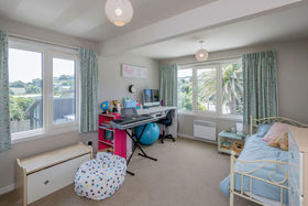 Above, the second level has three double bedrooms and a large office, served by an opulent bathroom and separate W.C - leading through from here, to the spacious open plan living and dining spaces with a streamlined kitchen. These areas open seamlessly to the outside through sliding doors that frame the sweeping sea and island views.
